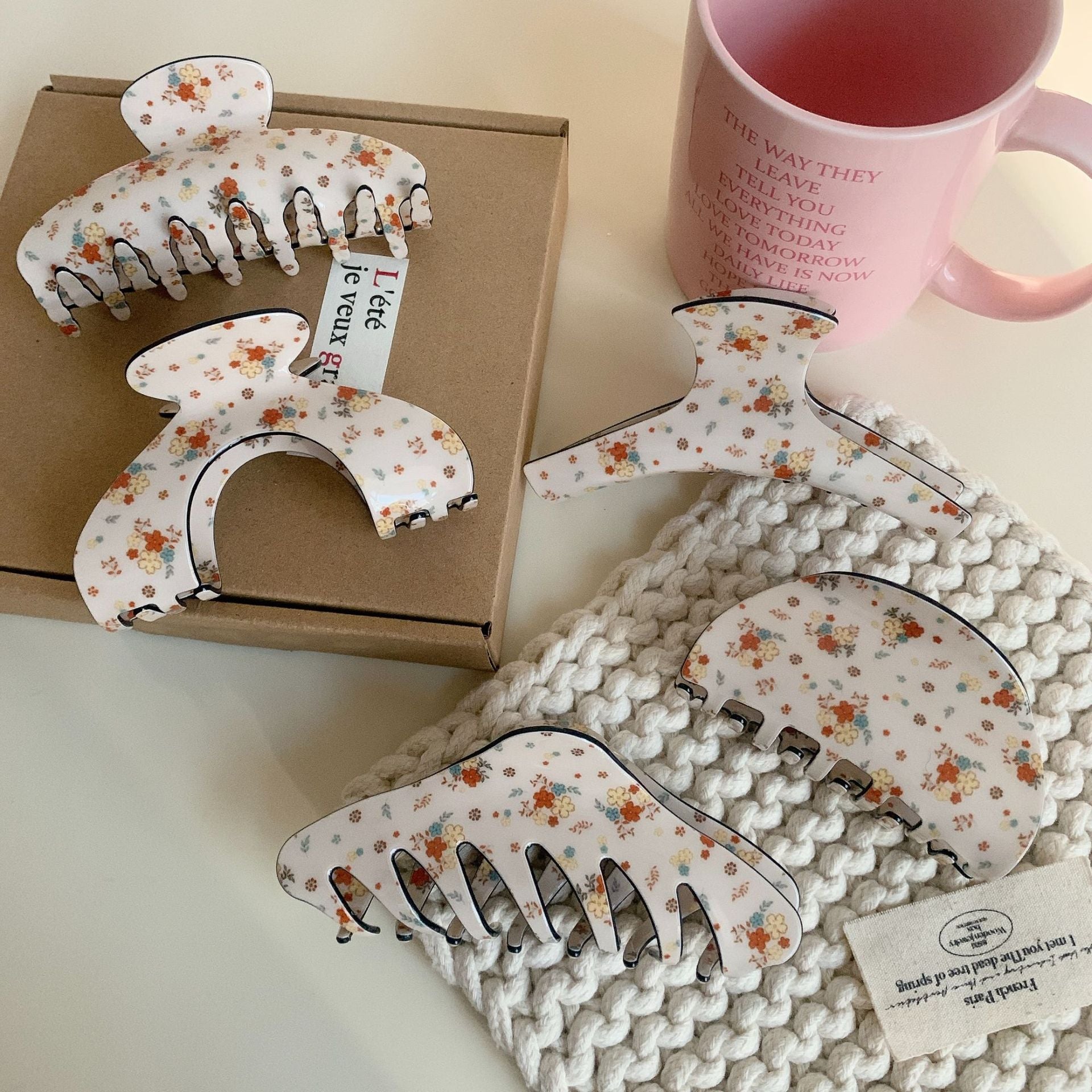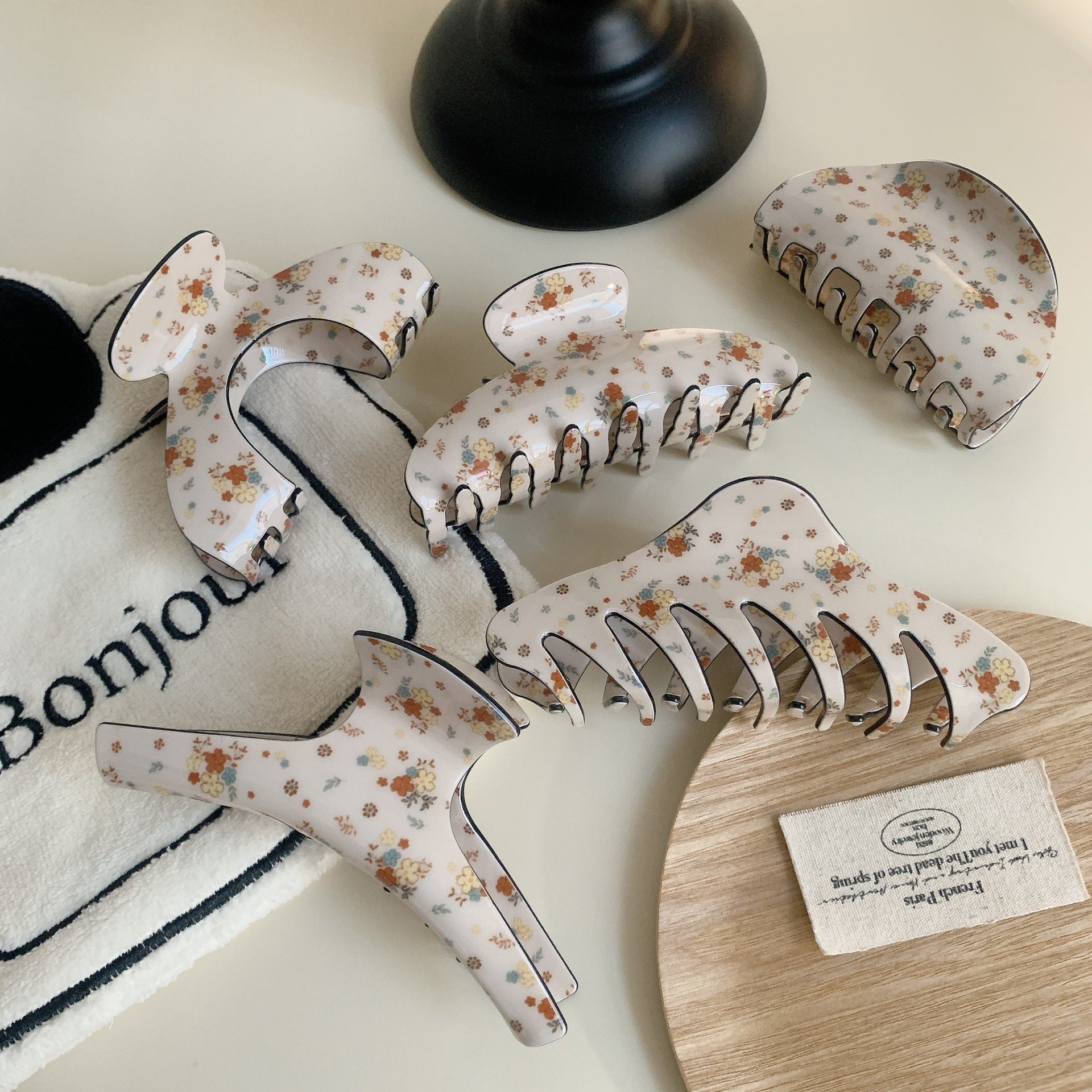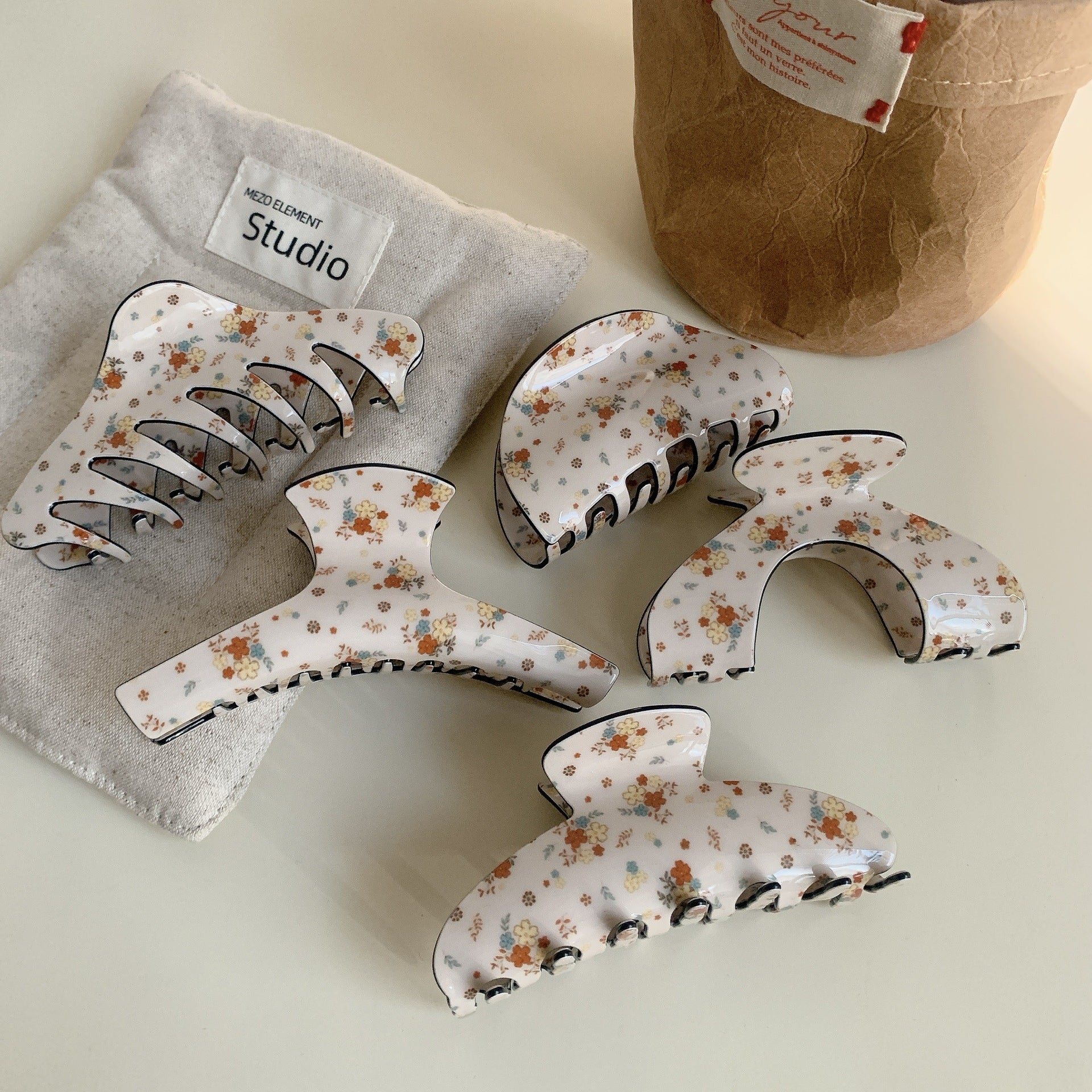 This handcrafted acrylic hair claw clip features delicate vintage-inspired flower prints, bringing a sweet and playful charm to your everyday looks. With five versatile silhouettes and a glossy finish, it's designed to suit everything from casual updos to effortless half-up styles.