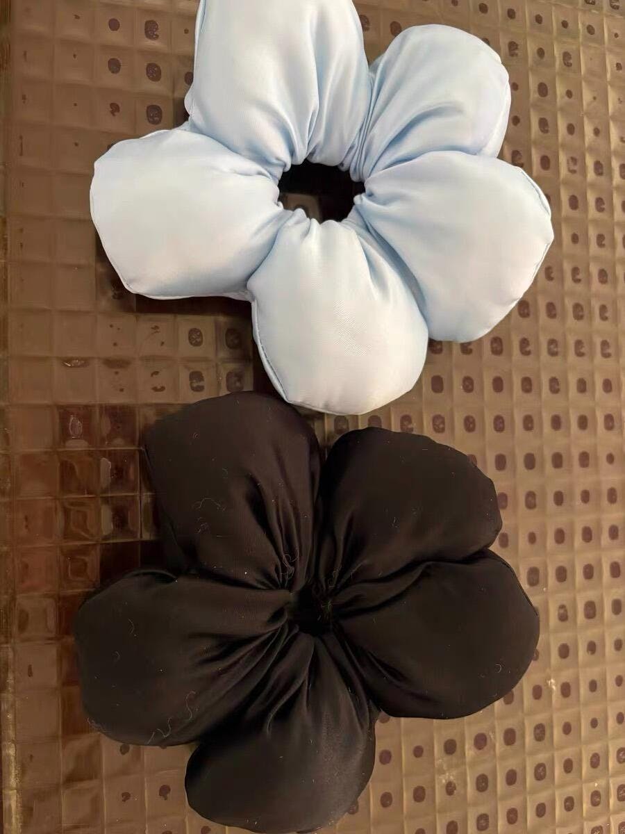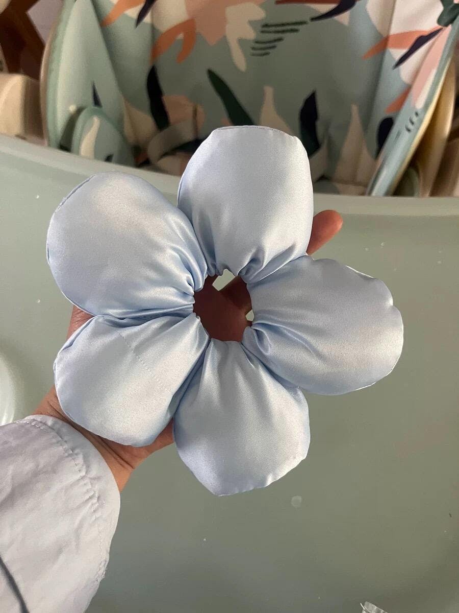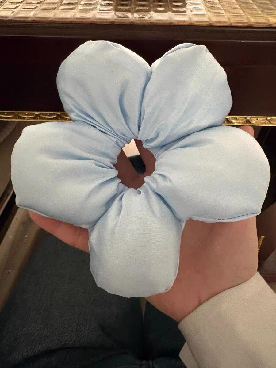 This handcrafted scrunchie features a plush flower silhouette made from airy satin fabric and cushioned sponge filling. Its oversized design adds a whimsical yet chic statement to ponytails, buns, or wrist styling. Lightweight and gentle on hair, it’s perfect for sunny days, travel looks, or everyday cuteness.