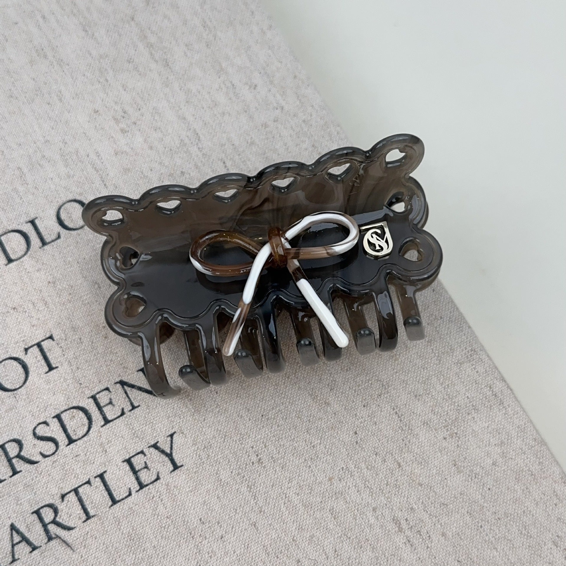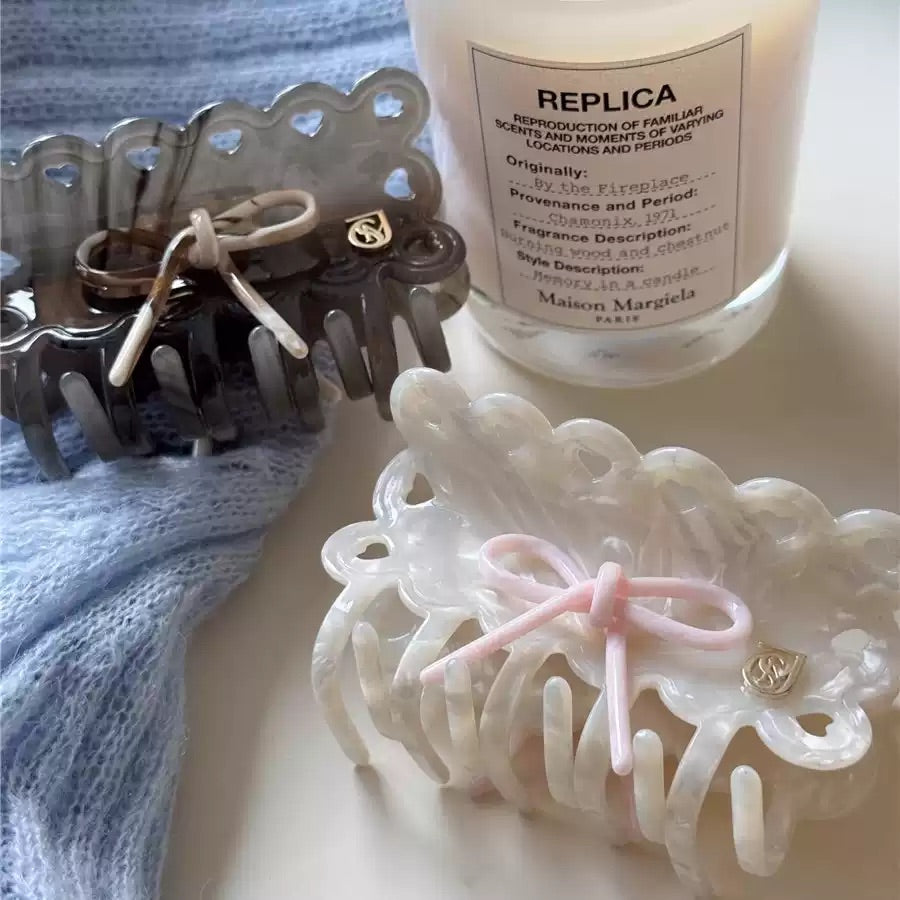 This unique double-sided hair claw features scalloped “cookie” edges with cut-out heart details, finished with a delicate 3D bow on top. Handcrafted from glossy acetate, it combines playful sweetness with practical hold.