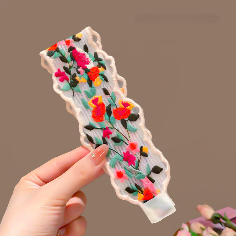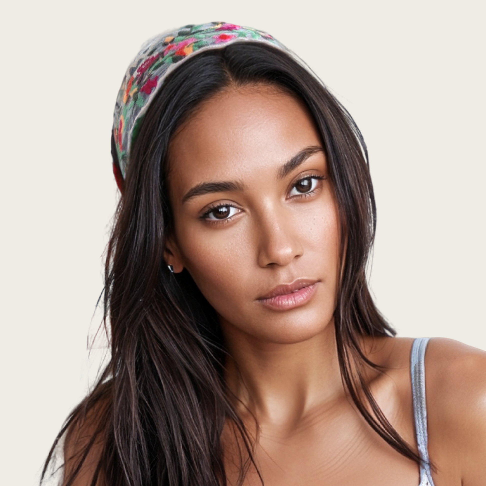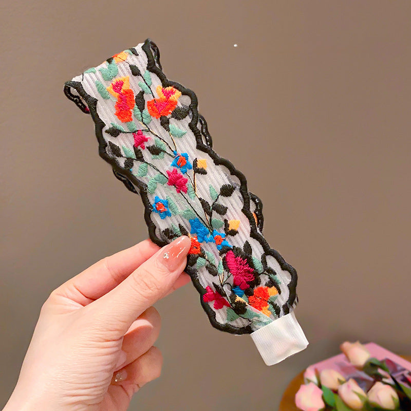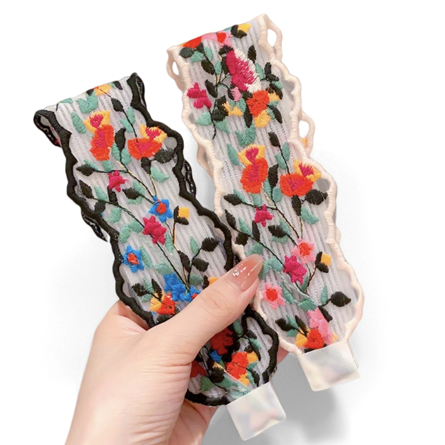 This handcrafted headband features delicate floral embroidery along a soft fabric base, finished with a wide band to create a flattering high-profile silhouette. The vintage-inspired design adds an air of elegance to everyday outfits and special occasions alike, from garden parties to city strolls.